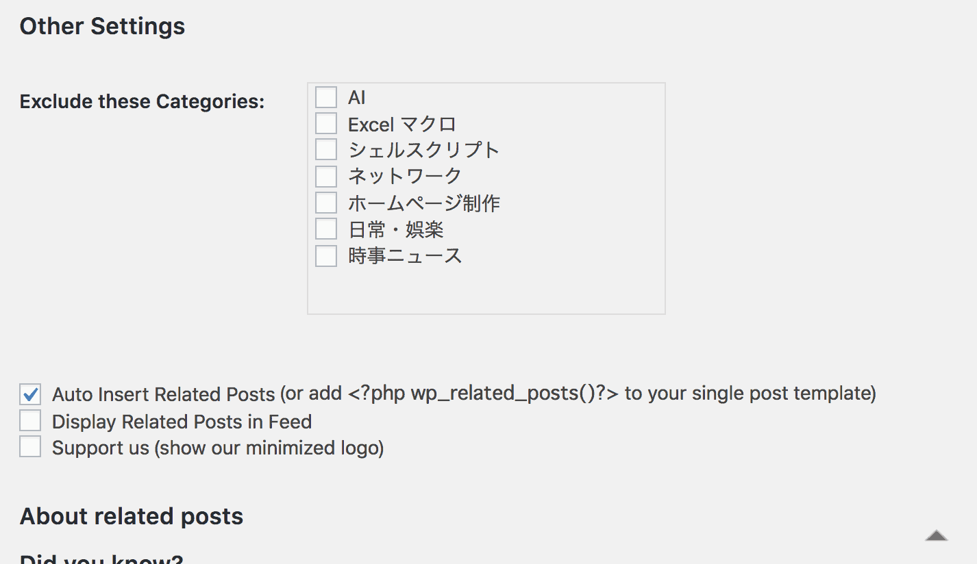 (6)ページの下の方に移動しますと、以下の画面箇所があります。これは関連記事に表示させないカテゴリを選択できます。今回は不要だったので何も選択しません。