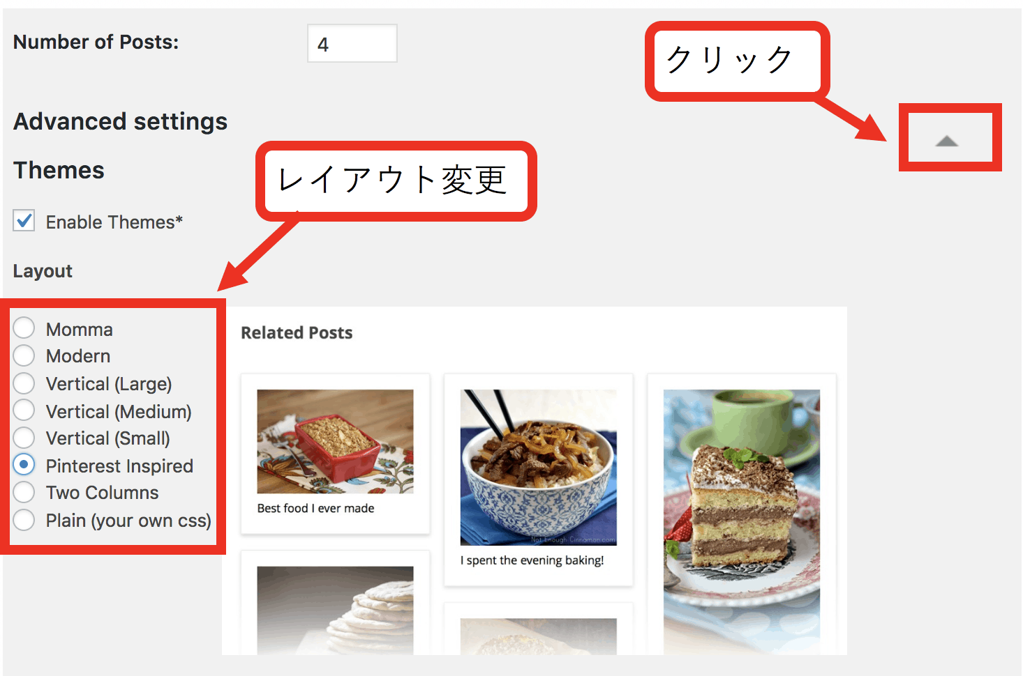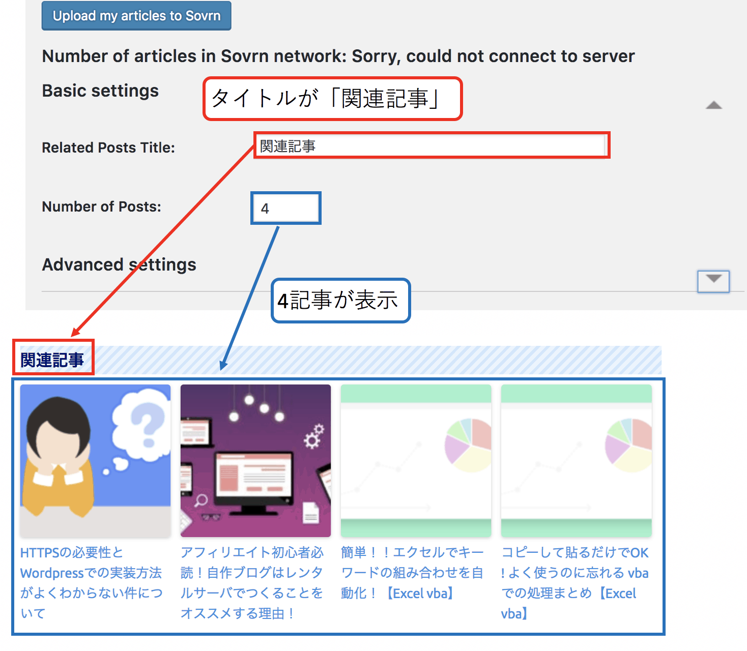 (4)「Related Posts Title」が記事タイトルで 「Number of Posts 」が表示される記事数です。下記では「Number of Posts 」を「4」と指定しているため 4記事が表示されています。